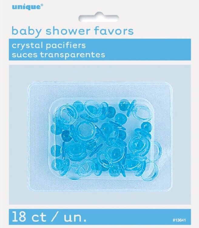 Lyseblå mini sutter er dekorative små sutter lavet af krystal plastik, ideelle til at pynte festborde til barnedåb og babyshowers.