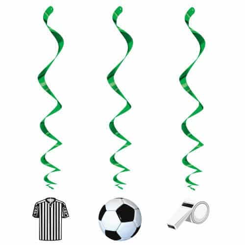 Denne dekorationstype består af farverige folie hvirvler prydet med runde fodboldmotiver, som gør dem til en attraktiv tilføjelse til ethvert festlokale med et fodboldtema.