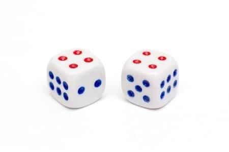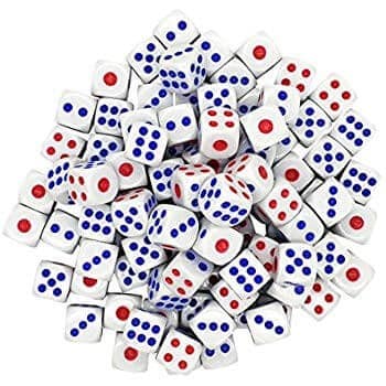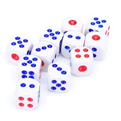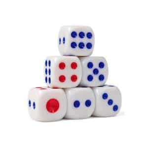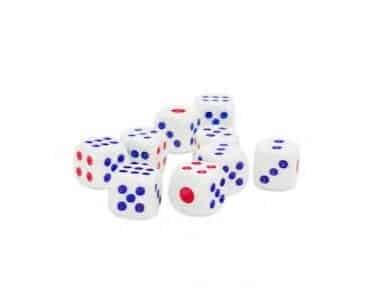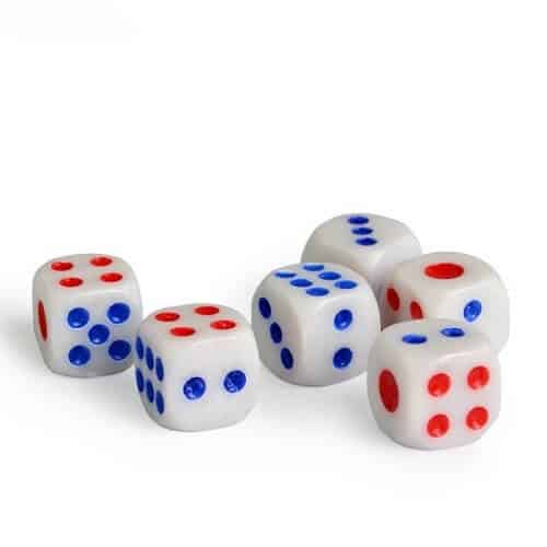 10 stk. fine hvide terninger med røde og blå prikker. Rigtig gode terninger til casino, spil, og leg.