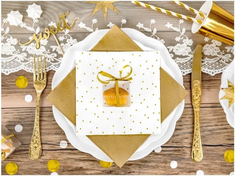 Vores store hvide servietter med guld prikker er perfekte til borddækningen til enhver fest. Om det er en nytårsfest, en konfirmation, firmafest, jubilæum eller en fødselsdag, er disse servietter uundværlige som en del af din borddækning og fest dekoration.