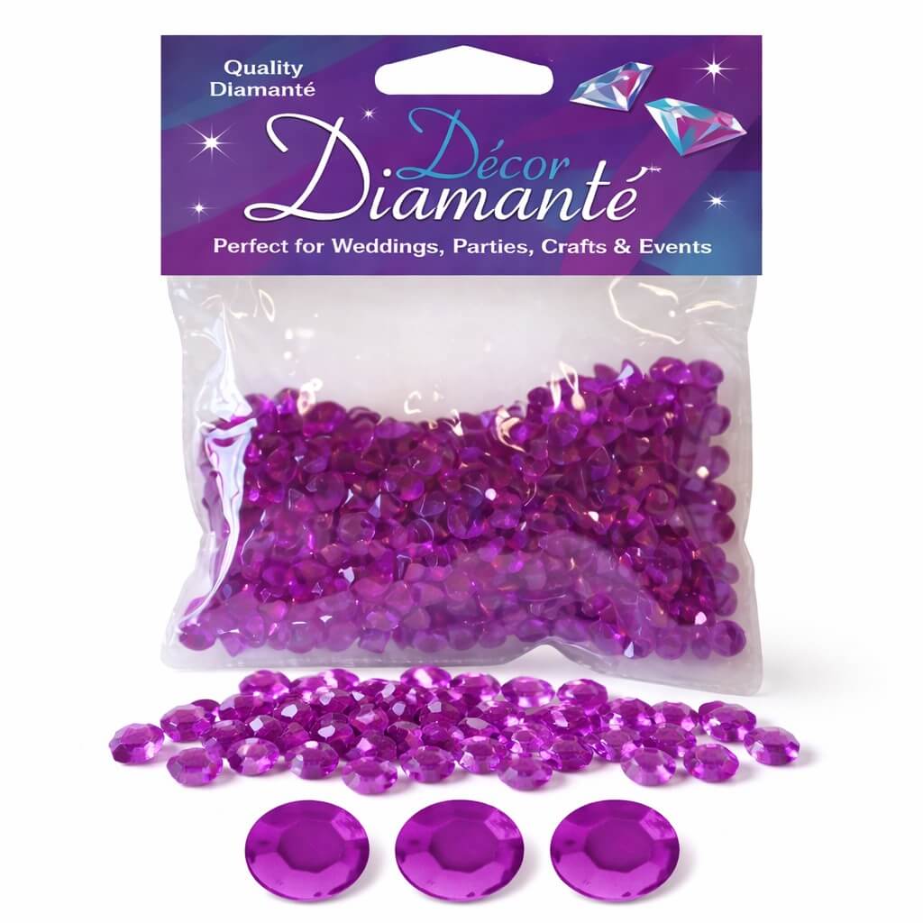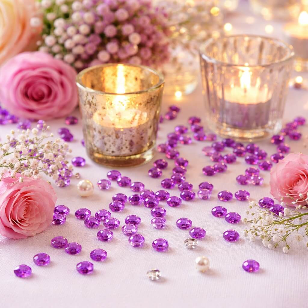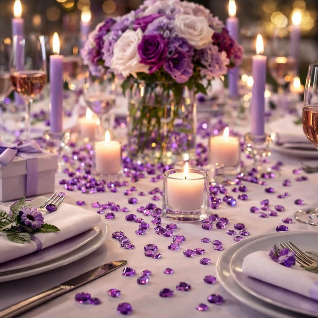 De lilla ametyst-farvede pynte diamanter er ideelle til bordpynt ved bryllupper, konfirmationer, fødselsdage og festlige begivenheder.