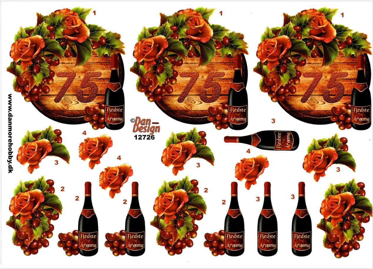 Køb 3D ark med tallet 75 på vintønde, vinflasker og blomster til din kortfremstilling
