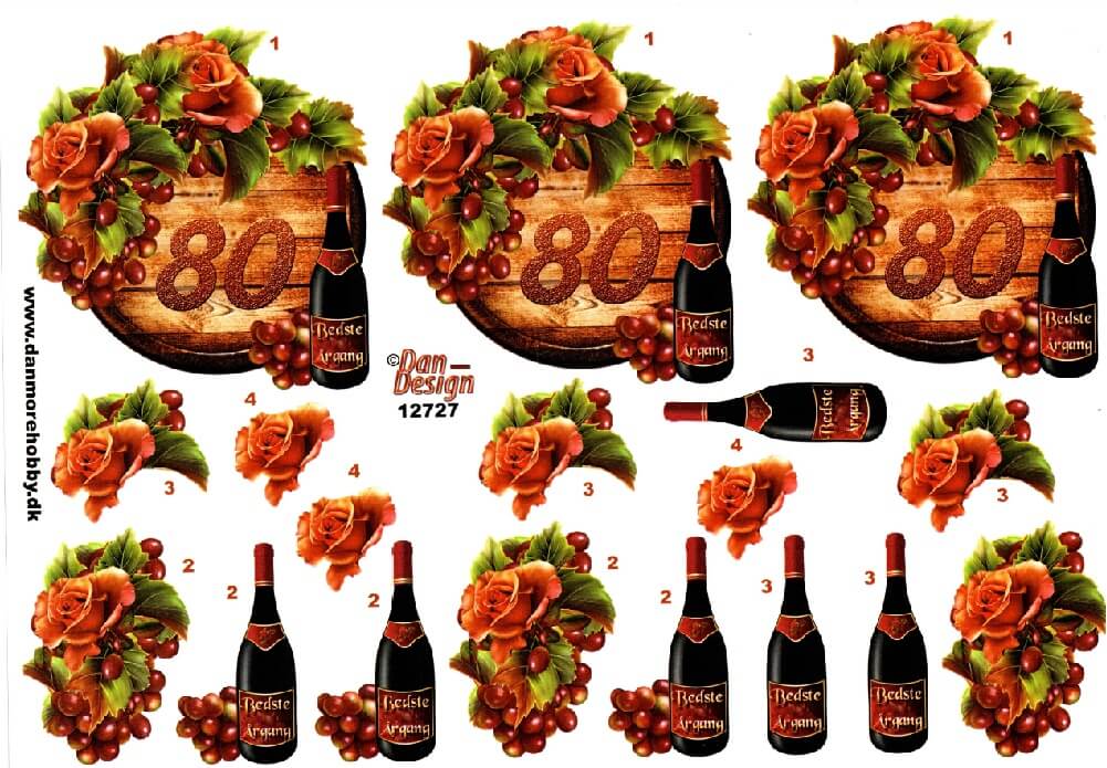 Køb 3D ark med tallet 80 på vintønde, vinflasker og blomster til din kortfremstilling