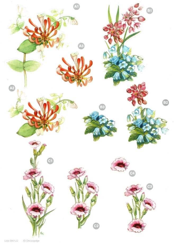Gør dine hjemmelavede kort levende med flotte og dekorative 3D effekter med dette 3D ark med udstanset motiver med nelliker og kaprifolie. Med udstanset 3D ark kan du hurtigt og nemt lave smukke hjemmelavede kort og scrapbooking med rigtig mange forskellige motiver. På selve arket er der forskellige motiver og figurer i forskellige størrelser og ved at sætte dem sammen ovenpå hinanden, så vil motivet nærmest hoppe ud af kortet.