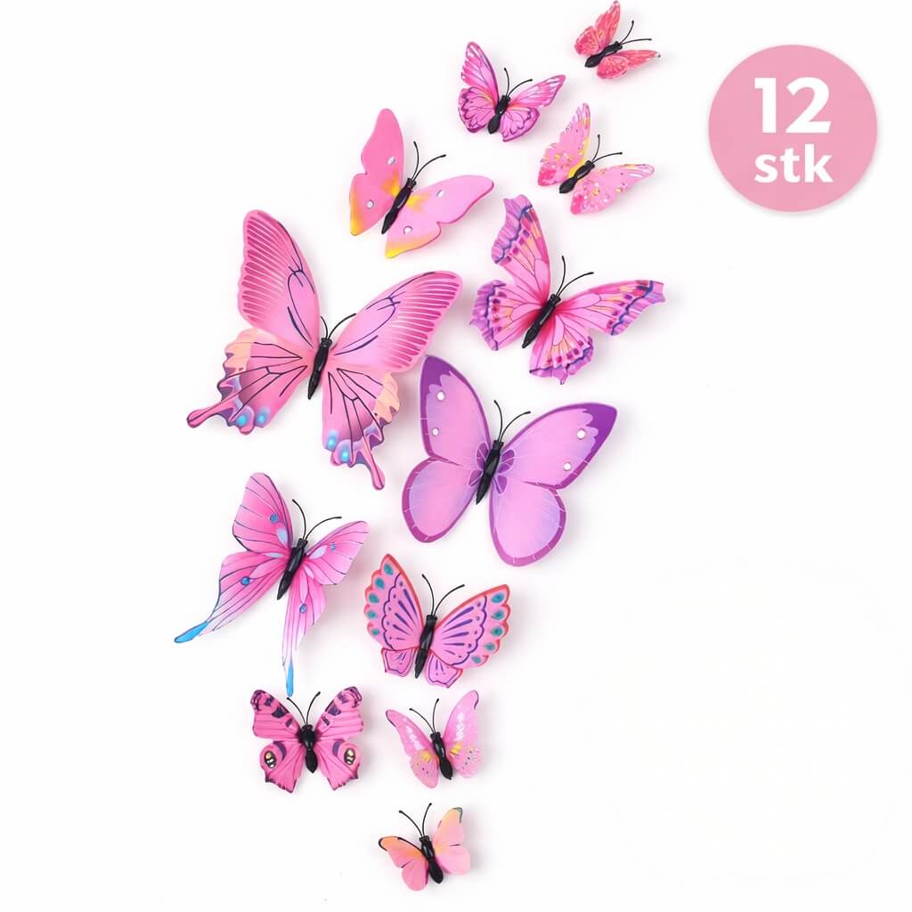 3D Sommerfugle Lyserøde – 12 stk Dekorative Væg Sommerfugle