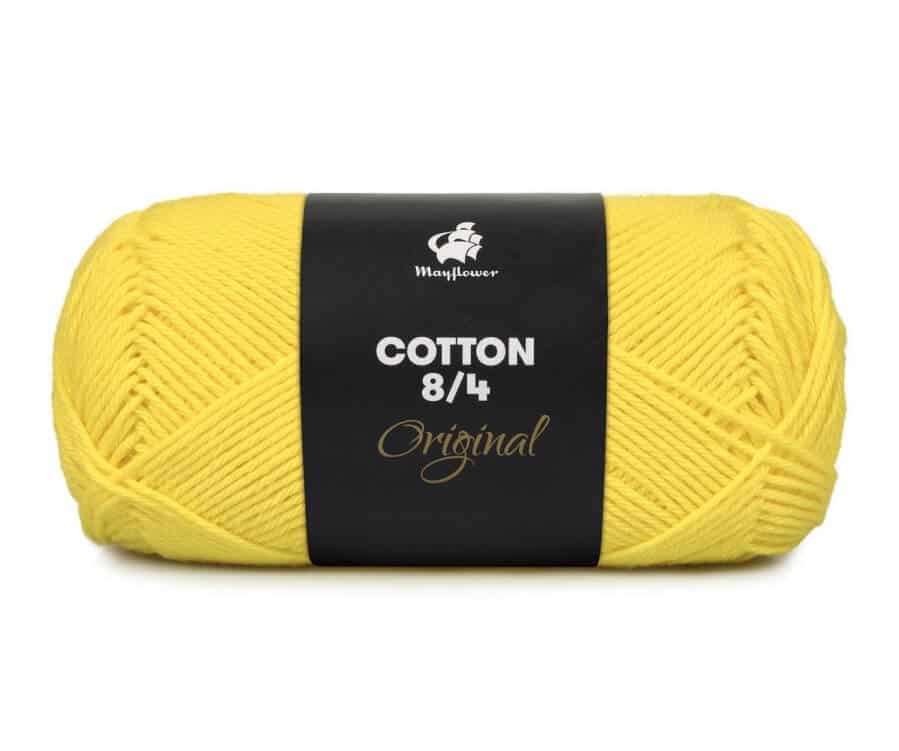Mayflower garn cotton 8/4 gul er et høj kvalitets 100% bomuldsgarn, der er kendetegnet ved sin holdbarhed, blødhed og alsidighed, hvilket gør det ideelt til en bred vifte af håndarbejd projekter som tæpper, bluser, toppe og babystrik.