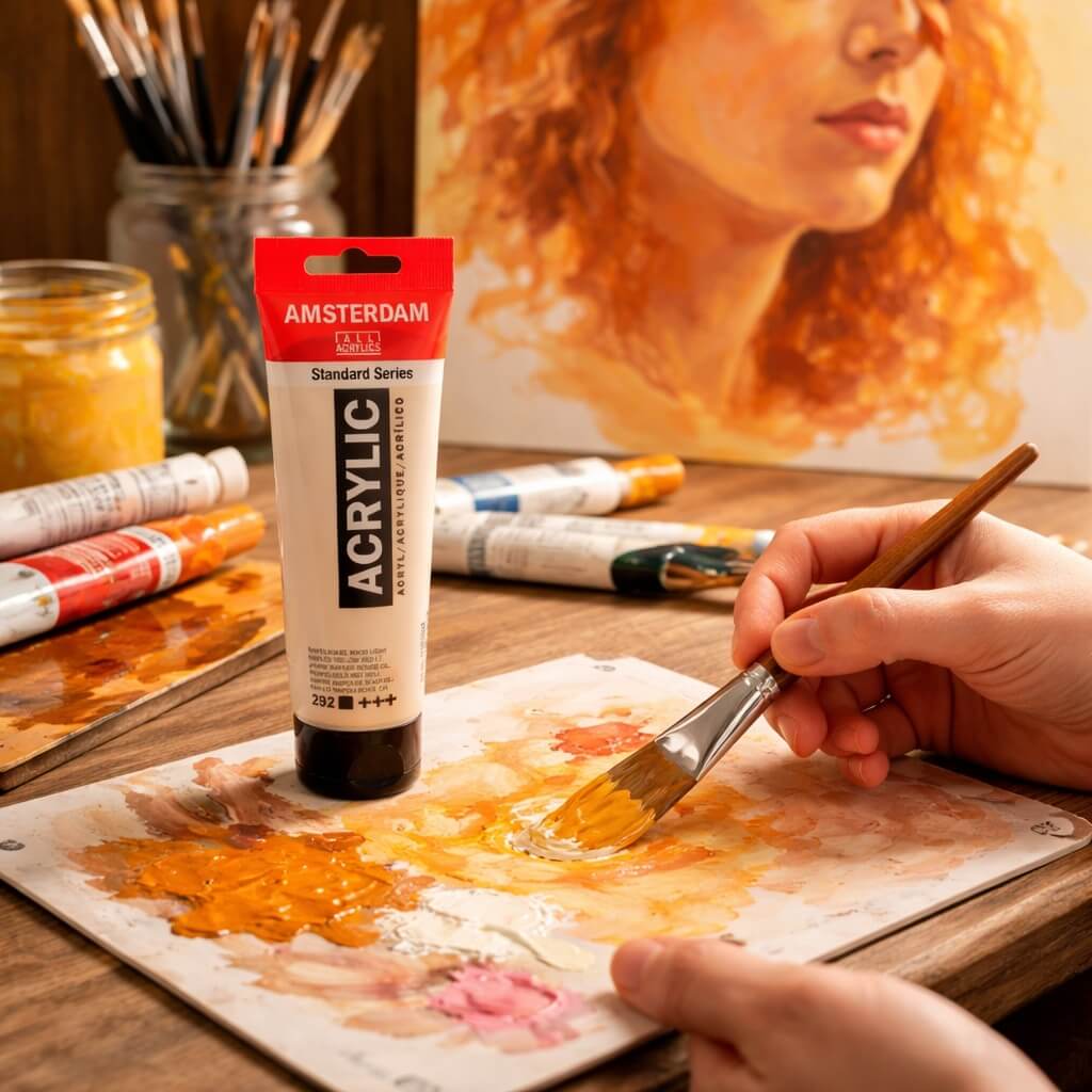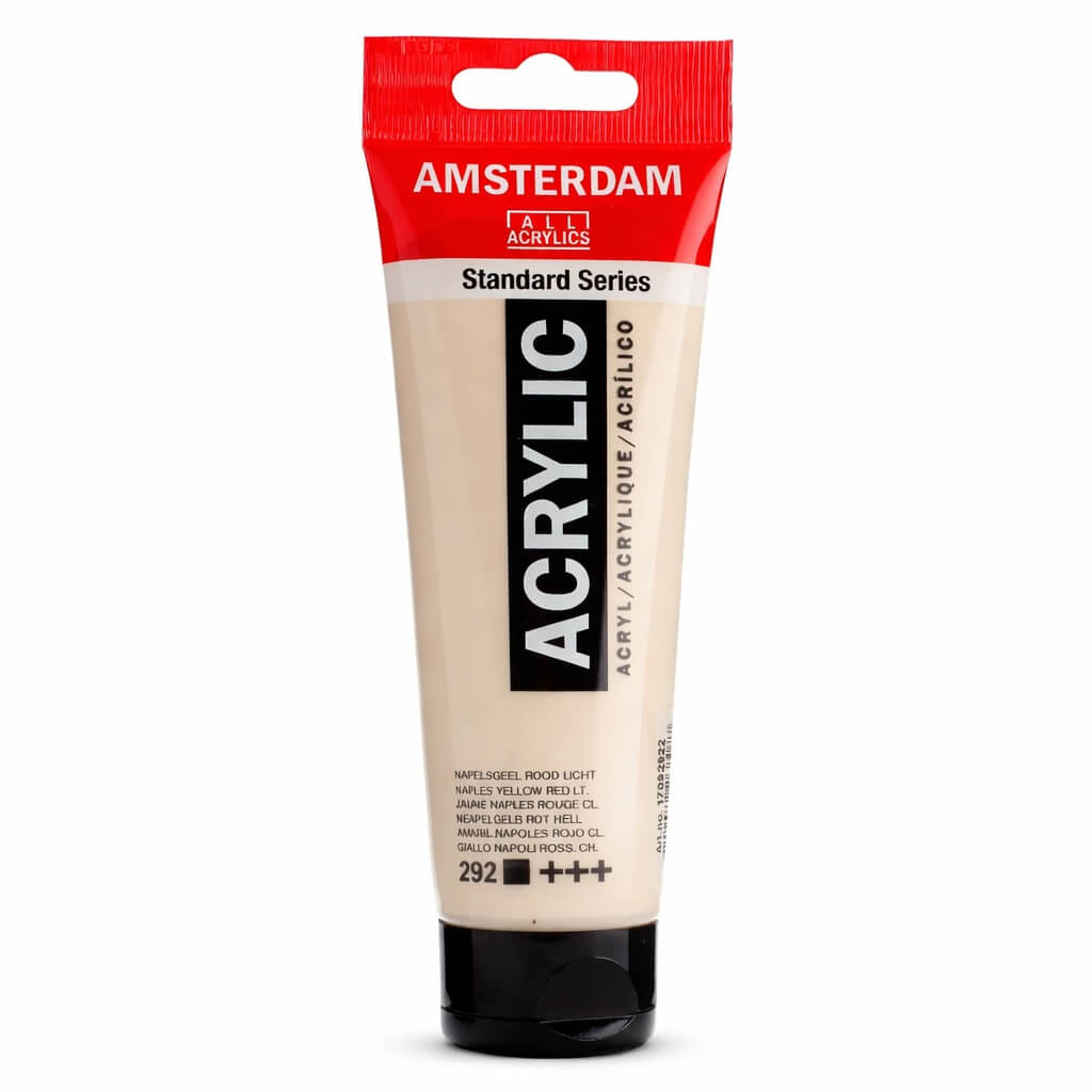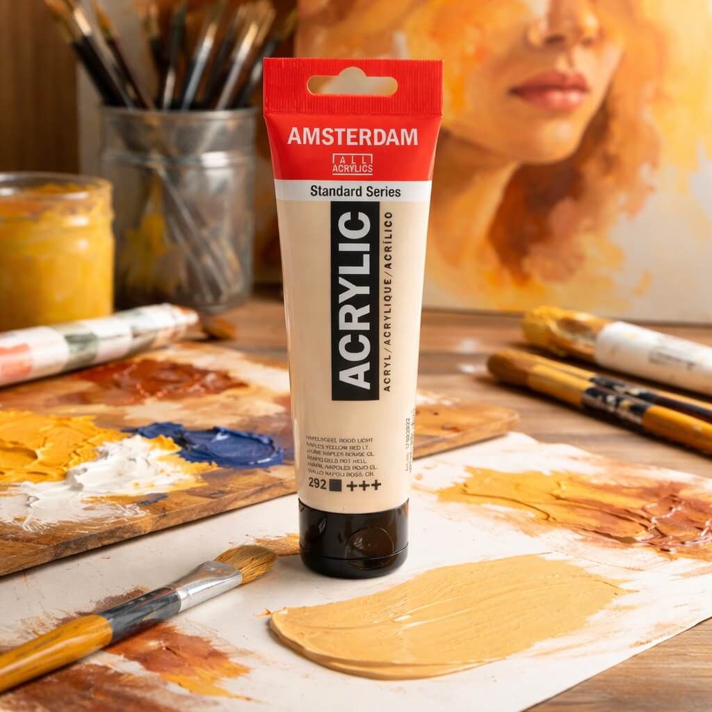 Amsterdam Standard Naples Yellow Red Light er en dækkende, varm gul akrylfarve med en let rødlig undertone, som giver en naturlig, jordnær glød.