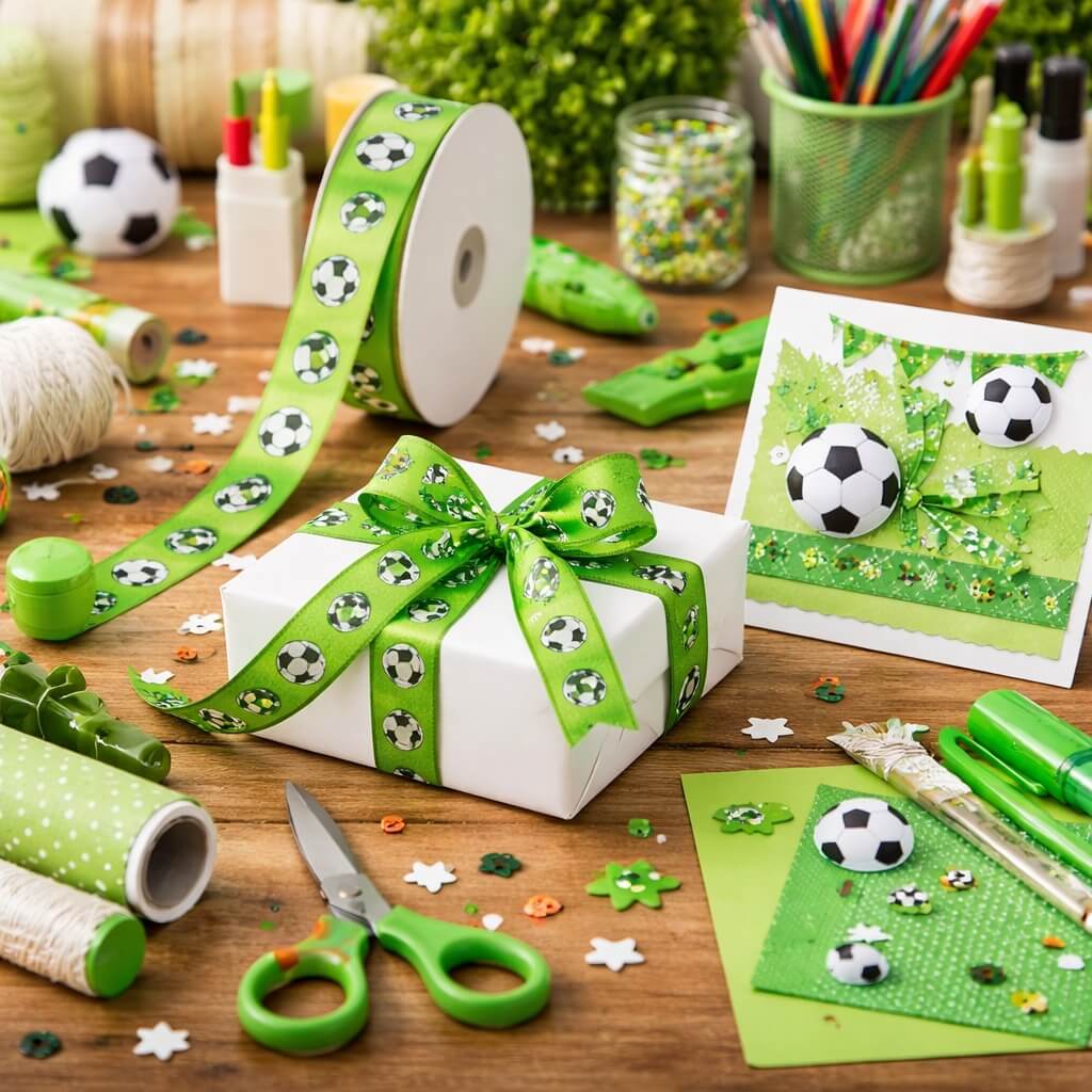Skab den perfekte fodboldstemning med dette grønne dekorationsbånd med fodbolde. Ideelt til festpynt, gaveindpakning og kreative projekter.