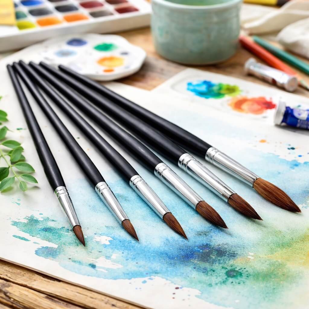 De runde pensler gør det nemt at arbejde med både fine detaljer, konturer og bløde overgange, hvilket gør sættet ideelt til akvarel, akryl og oliemaling.