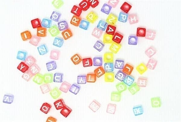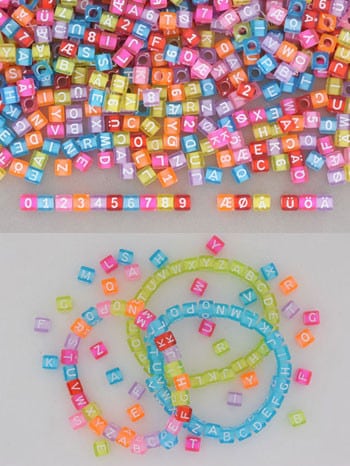 • Firkantede farvede perler med bogstaver og tal