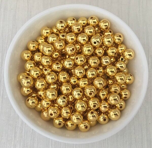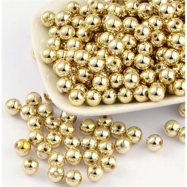 Disse perler er lavet af akryl og har en smuk guld farve med en perlemorsstrålende overflade, som giver dem et luksuriøst og tidløst udtryk.