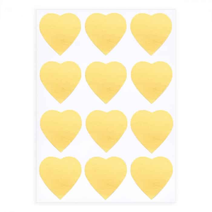 Ark med flotte og dekorative hjerte oblater i guld farve. Disse flotte og smukke guld hjerte stickers er fremstillet af metallic folie og er et perfekt og elegant tilbehør til et festligt indslag til festen, på små gaveæsker, pynt på gaver, på dekorationer og meget mere. De er også super dekorative på hvide balloner til brylluppet, børnefødselsdagen, firmafesten og andre mærkedage. De er ligeledes rigtig velegnede til lukning af sange til festen, på indbydelser og invitationer, pynt på julekort eller som pynt andre kort.