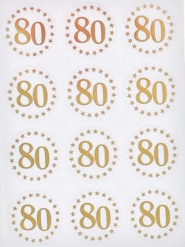Det flotte design på disse oblater består af tallet 80 og tallet er omgivet af stjerner i en flot skinnende guld farve, som skinner smukt når lyset rammer dem. 80 tallet og stjernerne er trykt på en transparent baggrund og gør at oblaten kan påsættes og anvendes på en hvid eller farvet overflade.