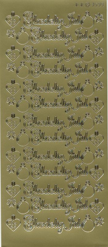 Selvklæbende guld stickers ark med tekst med Glædelig Jul og jule symboler og motiver.