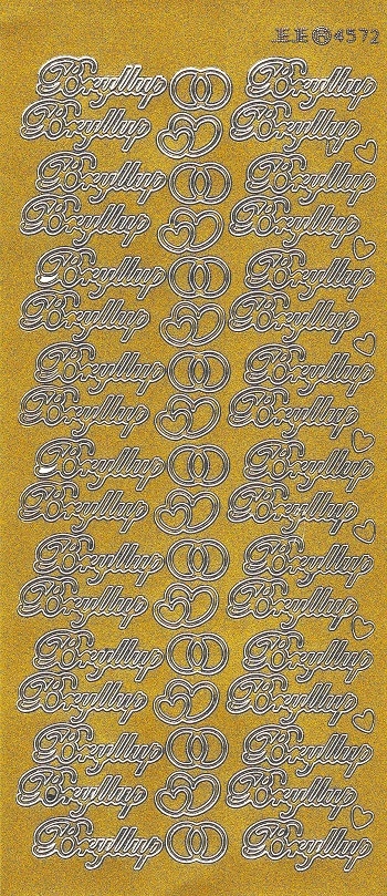 Selvklæbende stickers ark med guld farvet tekst: Bryllup til dine indbydelser, bordkort, scrapbooking, gavepynt og kort til brylluppet.