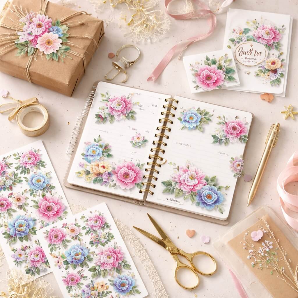 Gør dine DIY-projekter ekstra charmerende med stickers med blomster i smukke farver. Perfekte til planner, scrapbooking, kort og gaveindpakning.
