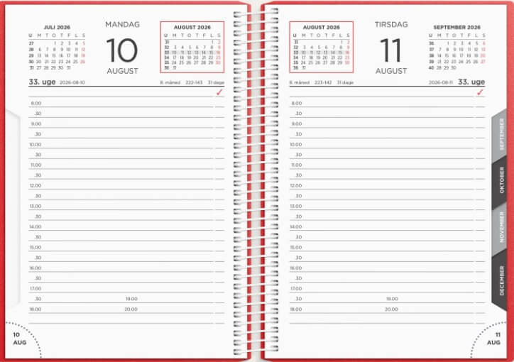 Med én dag pr. side og halvtimeinddeling fra kl. 8.00 til 20.00 får du et tydeligt og effektivt overblik over dagens opgaver, møder, aftaler og deadlines.