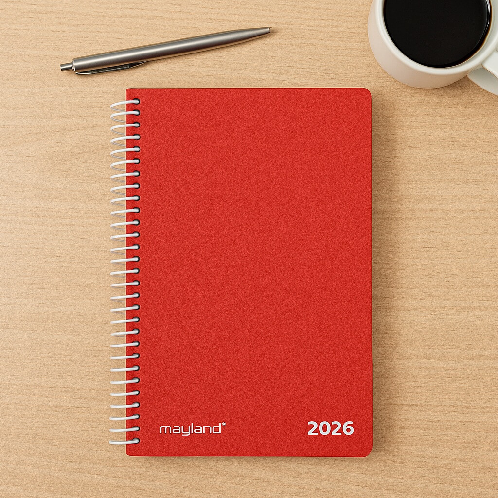 Den klassiske Mayland dagkalender 2026 i rød PP-plast er et uundværligt planlægningsværktøj for dig, der ønsker optimal struktur i hverdagen.