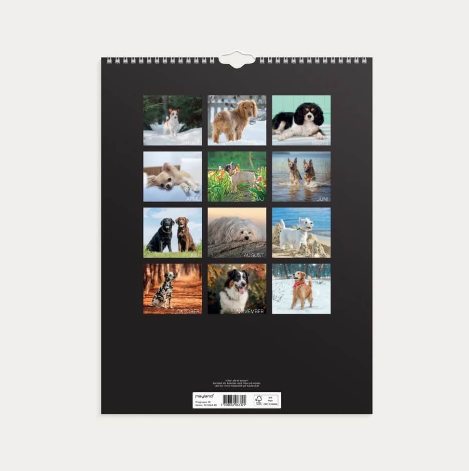 Bring glæde ind i hjemmet hver eneste måned med Vægkalender Hunde 2026 fra Mayland – en smukt designet kalender fyldt med 12 unikke og utrolig søde hundebilleder.