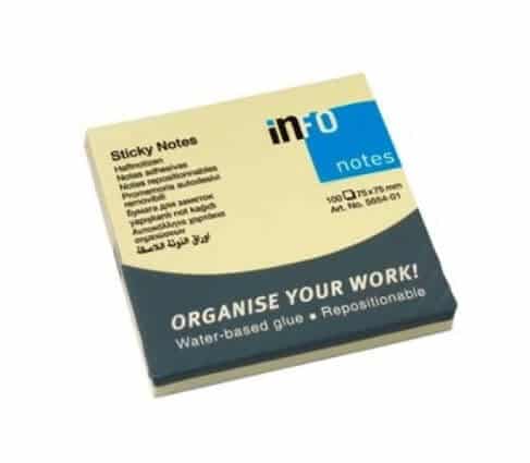 De smarte Sticky Notes leveres i en blok på 75mm x 75mm med 100 ark i gul farve, som giver dig mulighed for at nedskrive dine memoer og huskelister og hjælpe dig med at skabe et godt overblik, som netop passer dig og din måde at arbejde på. Denne memoblok er en standard udgave af det klassiske og firkantet format som gør dem perfekte til notering af korte beskeder, telefonnumre og andre nyttige informationer.
